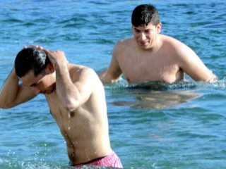 Sahildeki kafelerde çalışan 2 arkadaş şubat ayında denize girmenin keyfini yaşadı.