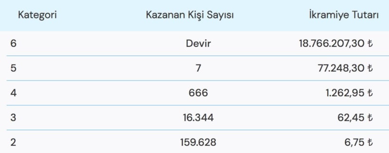 Büyük ikramiyenin 18.766.207,30 TL olduğu gecede 6 bilen çıkmadığı için büyük ikramiye devretti.