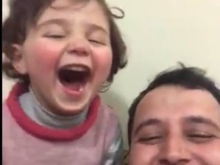 Görüntülerde arkadan bomba sesleri gelirken, kahkahalar atan minik Selva ve babası görünüyor.