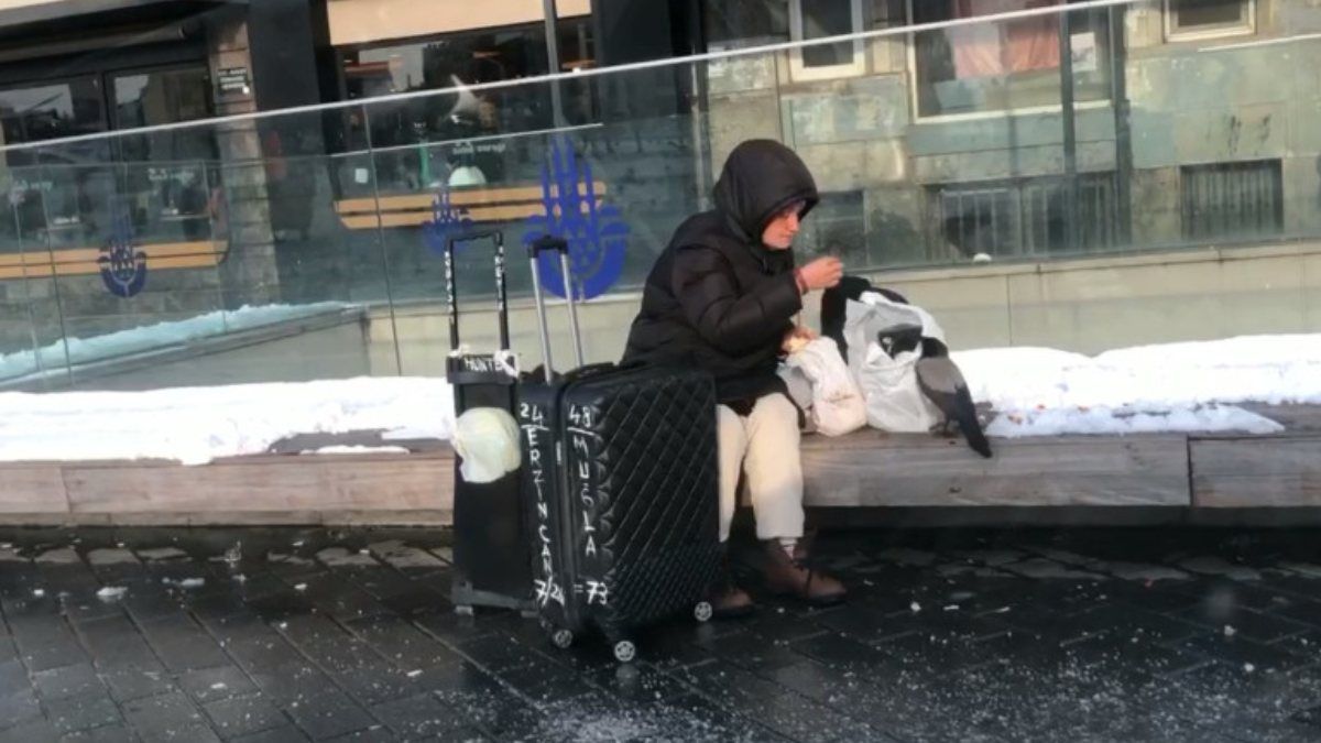 İstanbul Taksim'in Meydanı'nda sabah saatlerinde metronun girişinde oturarak kahvaltı yapan bir kadın, kargayla karşılaştı.