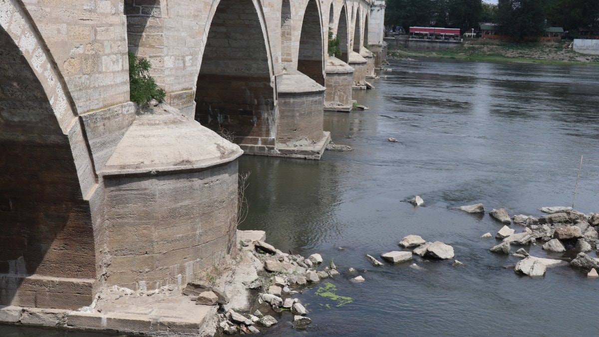 Meriç Nehri'nin su debisinin saatte 48 metreküp/saniye seviyelerine düşmesi, tarihi Meriç Köprüsü'nün ayaklarını ortaya çıkardı.