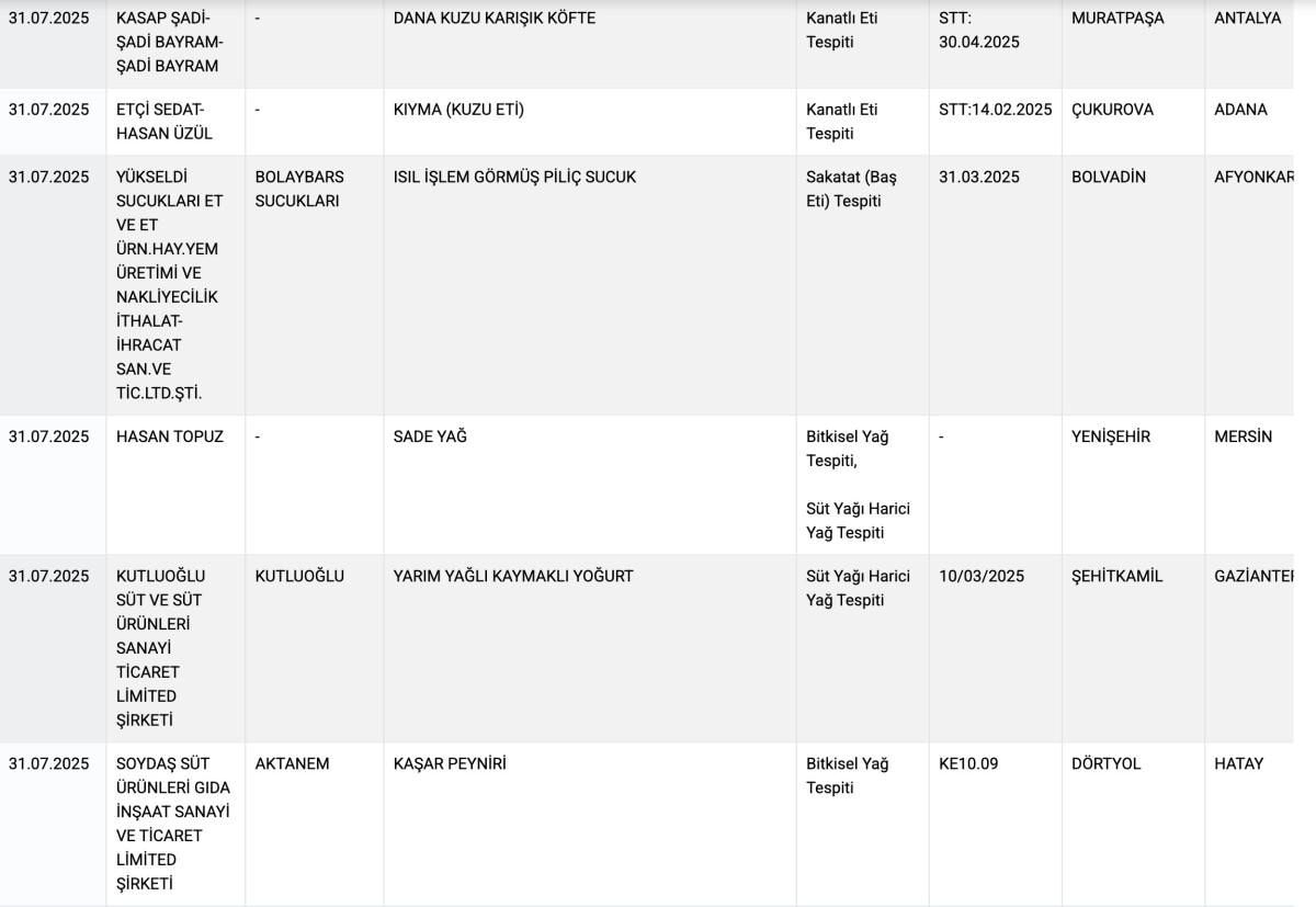 Kırmızı et ürünlerinde domuz eti, kanatlı eti ve sakatat tespit edilirken peynir ürünlerinde belirtilen yağ oranlarından düşük oranlar, zeytin yağlarında diğer tohum yağları ve baharat ürünlerinde yabancı maddeler tespit edildi.