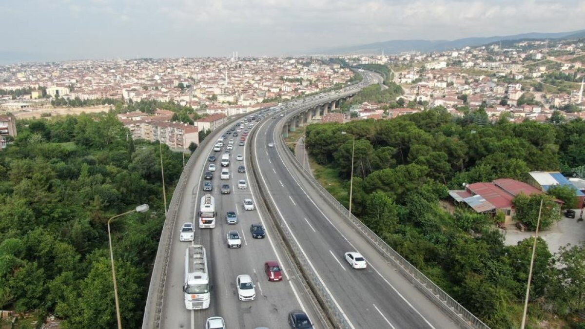 TEM Otoyolu Derince, Körfez, İzmit geçişinde trafik zaman zaman durma noktasına gelirken, oluşan yoğunluk havadan görüntülendi.