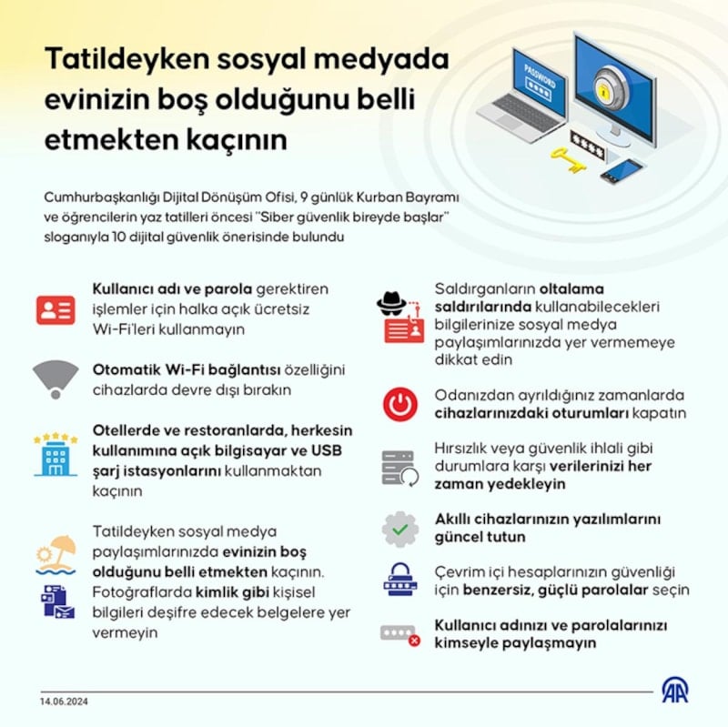 Bu durumun yaratacağı tehlikelere karşı, Cumhurbaşkanlığı Dijital Dönüşüm Ofisi, tatil öncesi "10 dijital güvenlik önerisi" hazırladı.