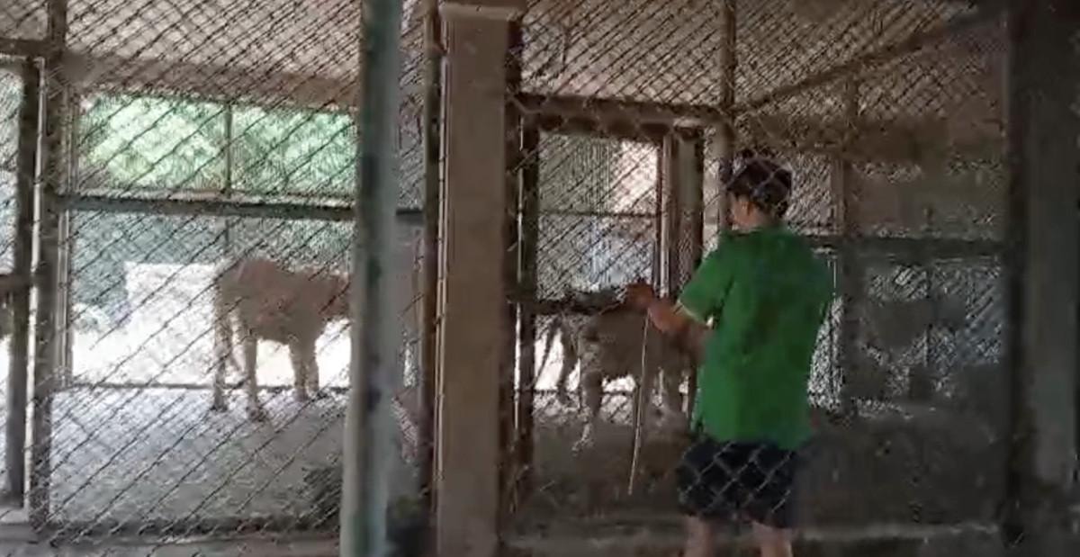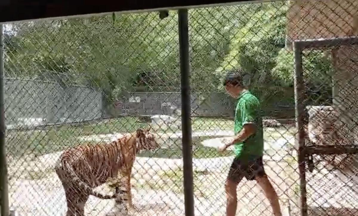Vahşi hayvanlarla korumasız olarak yaklaşılan çiftliklerin birinde Taylandlı bakıcının korumasız olarak yırtıcı kaplanların arasında dolaşması dikkati çekiyor.