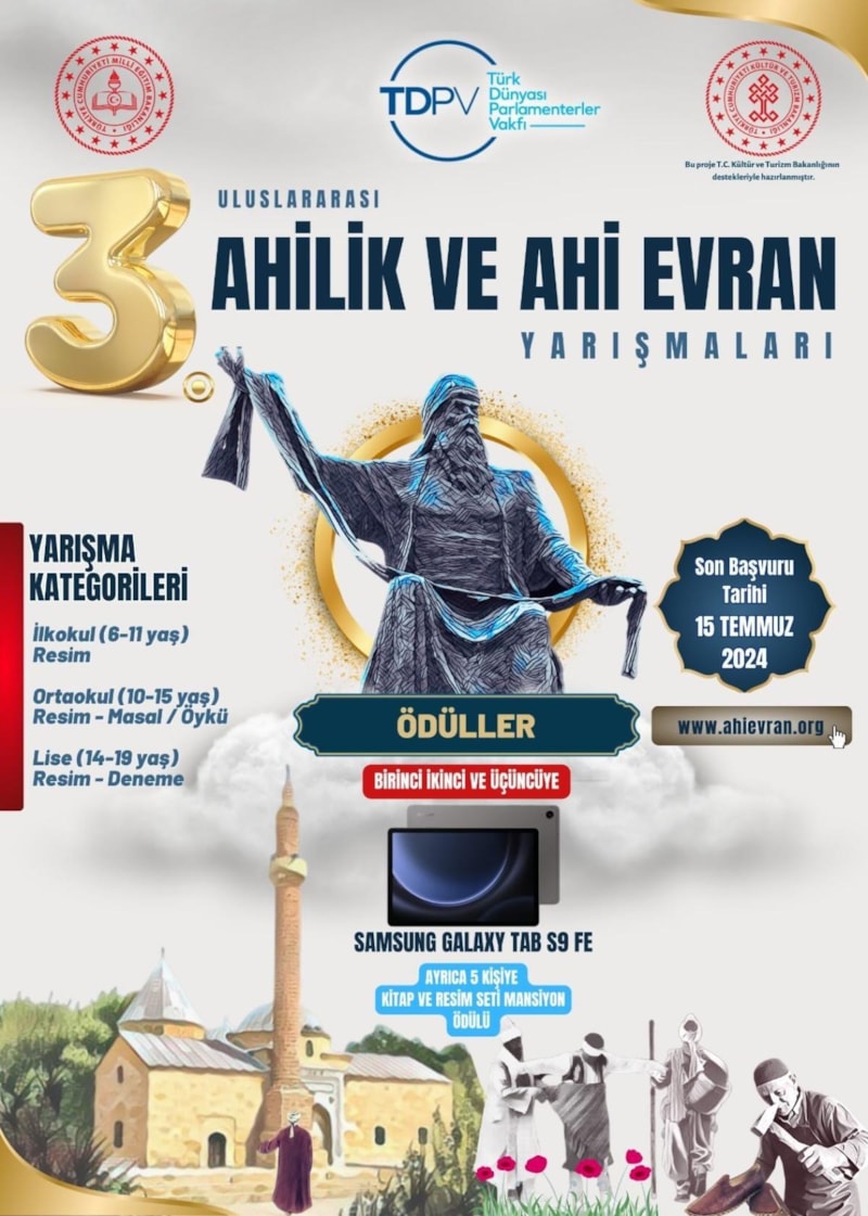 TDPV tarafından Ahi Evran'ın evrensel değerlerin anlaşılmasına yönelik düzenlenen 3. Ahilik ve Ahi Evran yarışmalarına son başvuru tarihi 14 Temmuz 2024 olarak açıklandı.