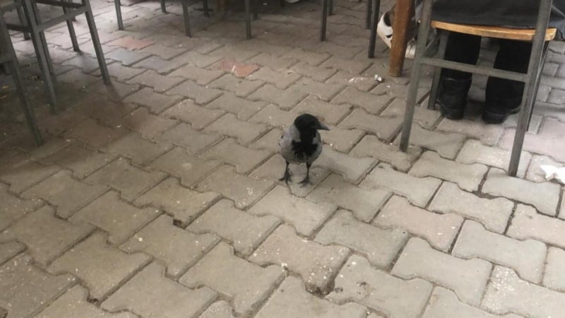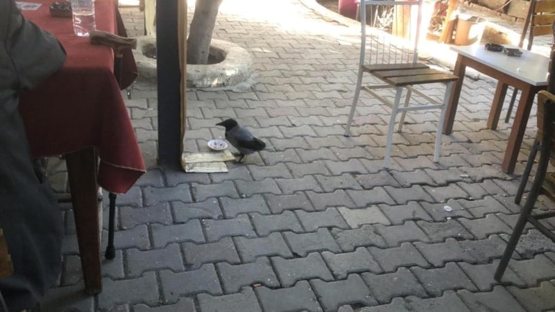 Datça’da tedavi edilen Rıfkı adlı karga, mahallenin maskotu haline geldi. Geceleri kafeste, gündüzleri ise kahvehanede vakit geçiriyor.