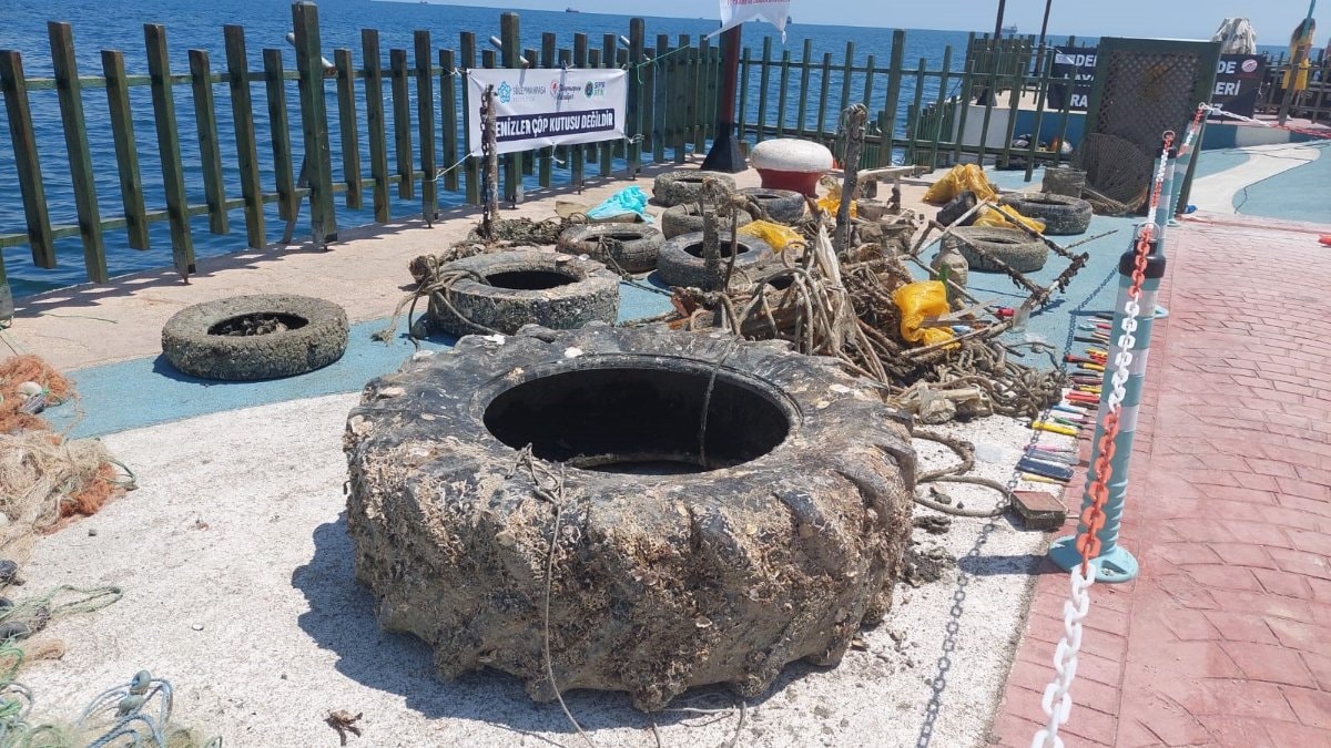 Denizin dibinden hayalet ağlar, traktör lastiği, demir parçaları, bıçak, telefon benzeri onlarca atık çıktı. Denizden çıkan atıklar kıyıda sergilenirken, çöpleri ve atıkları gören vatandaşlar hayretler içerisinde kaldı.