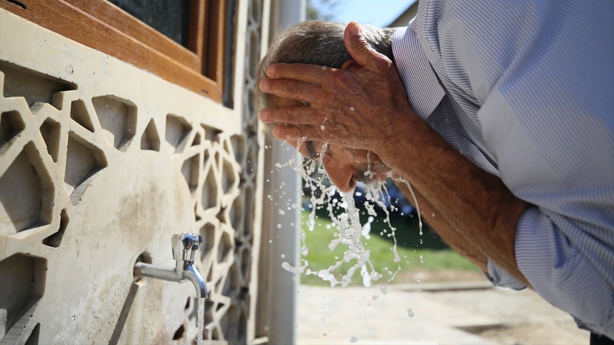 Sıcaktan korunmak isteyen bazı kent sakinleri, gölgelik alanlarda vakit geçirirken bazıları çeşmelerden yüzünü ve başını ıslatarak serinlemeye çalıştı.