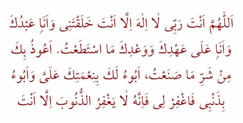 Okunuşu: “Allahümme ente Rabbî lâ ilahe illâ ente halaktenî ve ene abdüke ve ene alâ ahdike ve vâ’dike mes’tetâtü eûzü bike min şerri mâ sanâtü ebû’ü leke bi-nîmetike aleyye ve ebû’ü bizenbî fağfirlî feinnehû lâ yağfıruz-zünûbe illâ ente”