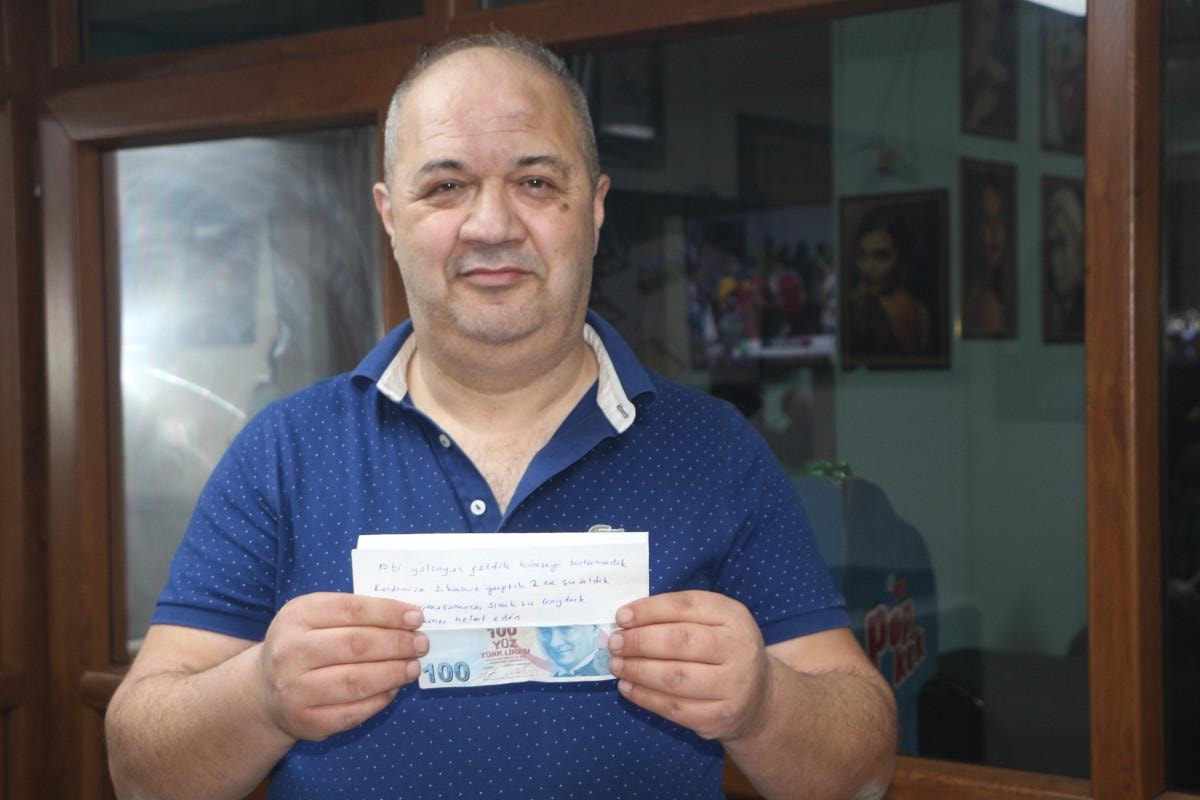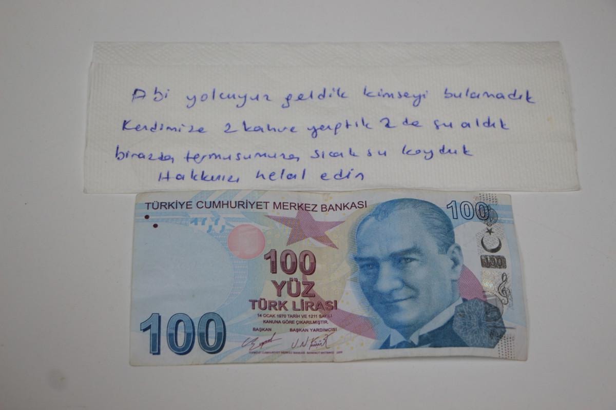 Ramazan dolayısıyla iş yerimiz iftara kadar kapalı. Fakat sabah saat 09:00’dan itibaren vatandaşlarımızın oturup sohbet edebilmesi ve abdest alıp camiye gidebilmeleri için kapıları açıyoruz. Bugün öğleden sonra işyerime geldiğimde masada bir not ve 100 TL buldum. Sanırım yolculuk yapan bir çiftti. Kıraathaneye girip kendileri kahve yapmış, su içmiş ve ardından bize not bırakıp paralarını bırakıp gitmişler. Notta 'Abi, yolcuyuz, geldik kimseyi bulamadık. Kendimize iki kahve yaptık, su aldık, termosumuza da biraz su koyduk. Hakkınızı helal edin' yazıyordu. Güvenlik kamerasını izleyince gerçekten de notta yazdığı gibi bir erkek ve bir kadın kahvelerini içip, yollarına devam etmişler. Gerçekten bizi şaşırttı.