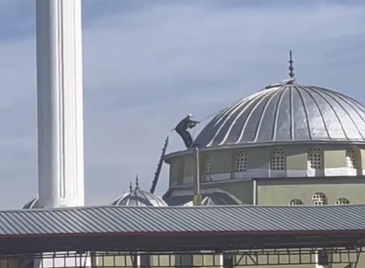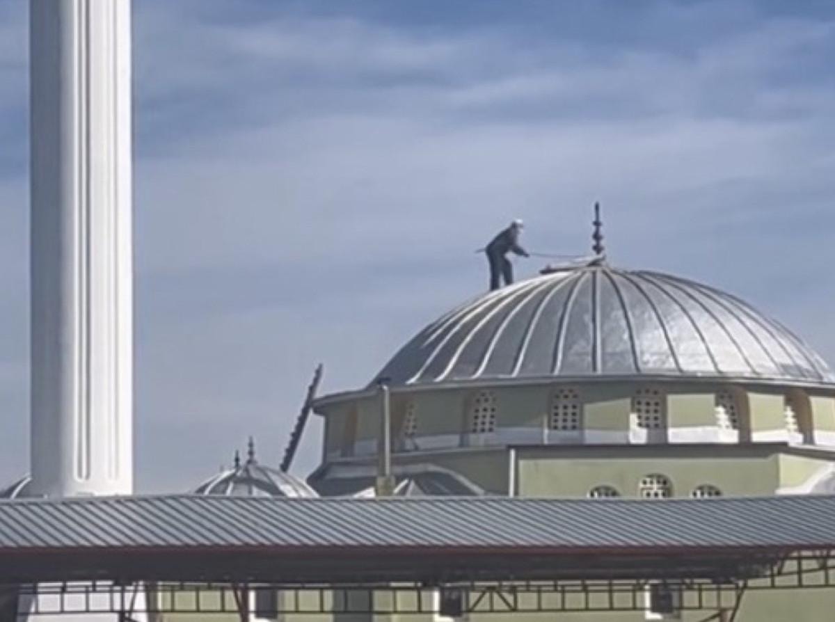 Yuvayı yerleştirmek için kubbeye tırmanan yaşlı adamı köyün gençleri görüntüledi.