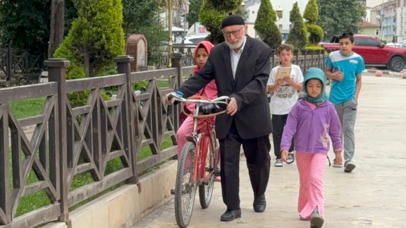 Torunları 8 yaşındaki Hafsa Sultan Kaya ve 5 yaşındaki Şeyma Kaya’nın Kur’an-ı Kerim öğrenmesini isteyen Kaya, her sabah bisikletini alıyor.