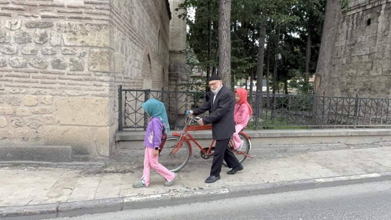 Küçük torununu bisikletin arkasına oturtan Kaya, diğer torunuyla yürüyerek caminin yolunu tutuyor.