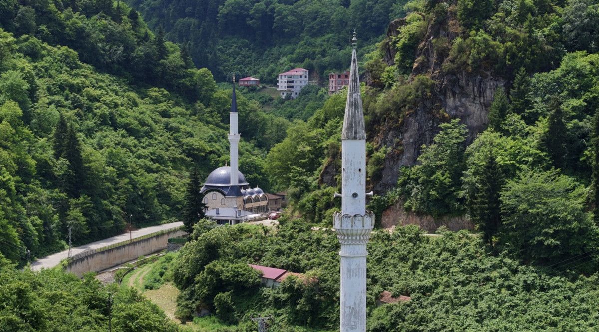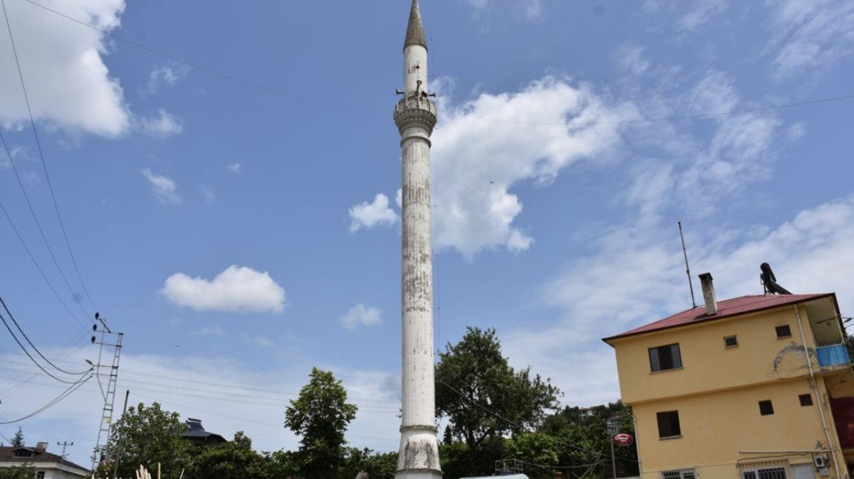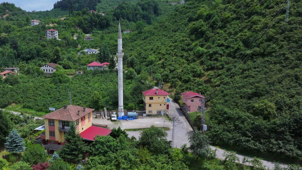 Trabzon'un Yomra ilçesinde zemin çökmesi dolayısıyla 8 yıl önce yıkılan caminin tek kalan minaresi, görenlerin dikkatini çekiyor.