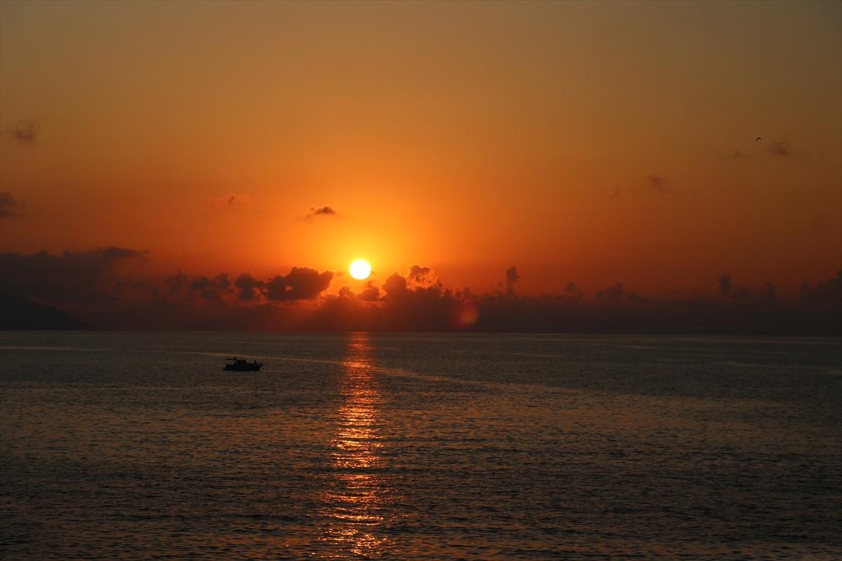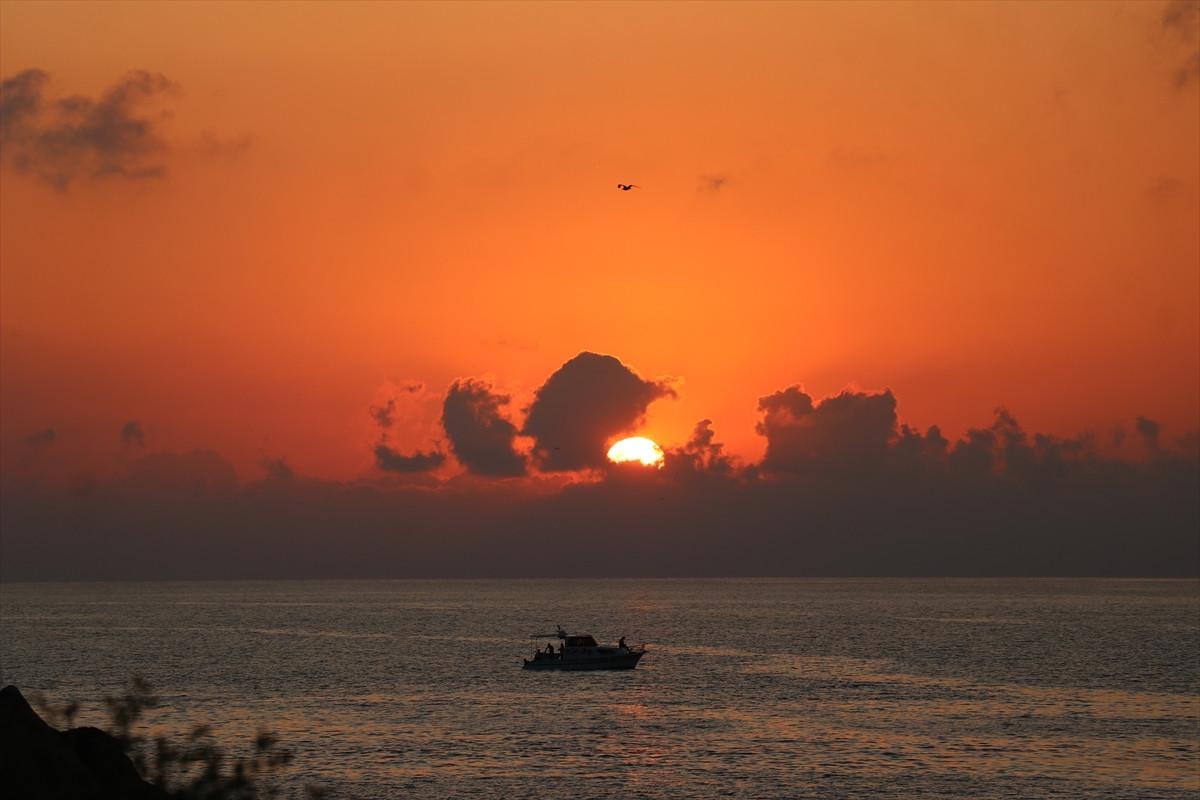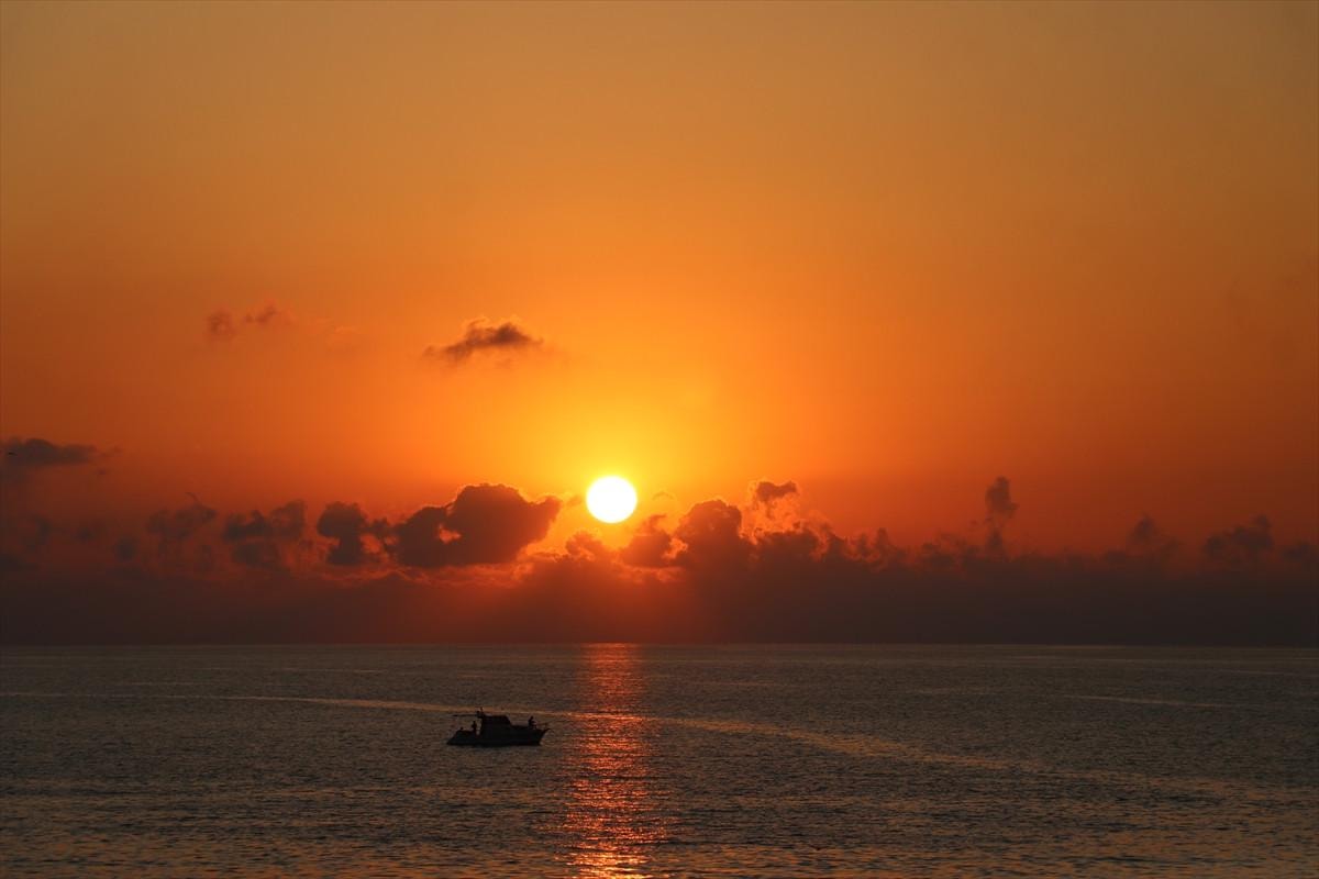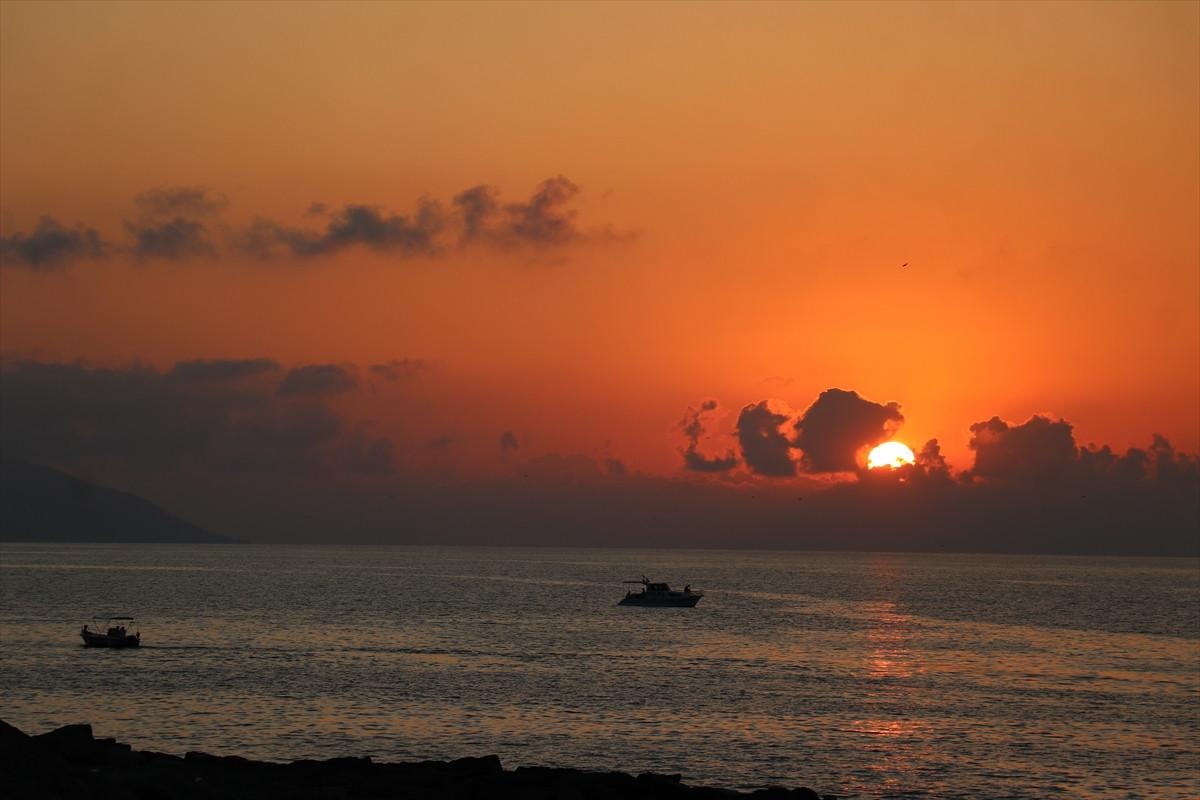 Ortahisar'da gün batımı esnasında oluşan kızıl renk, balıkçı tekneleriyle birleşince eşsiz görüntüler ortaya çıktı.