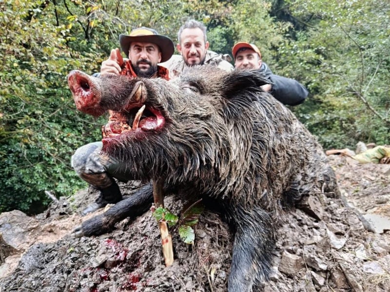 Araklı ilçesinin Yeşilyurt Vadisi’nde av köpeklerinin desteğiyle düzenlenen sürek avının dikkat çeken anı ise yaklaşık 300 kilo ağırlığındaki dev yaban domuzunun etkisiz hale getirilmesi oldu.