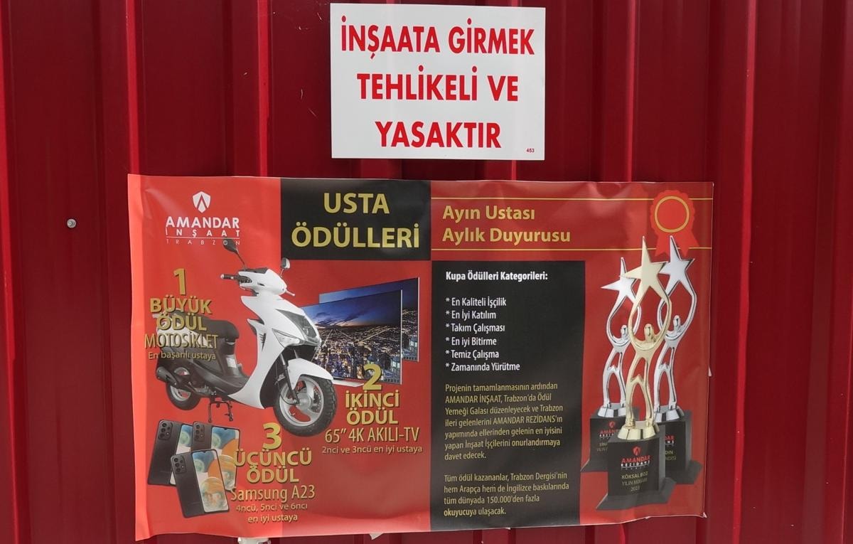 Proje sonunda çalışanlara gala yemeği verileceği de duyurulan inşatta, işçiler, afişi asılan motosiklet, TV, telefonun yanı sıra 'en iyi işçilik', 'takım çalışması' gibi dallarda oluşturulan hediyelerin yer aldığı büyük ödülü almak için ter döküyor.