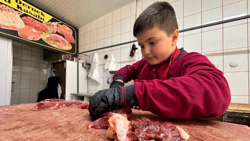Dernekpazarı ilçesinde 10 yaşındaki Melih Cansız, okul sonrası babasının kasap dükkanında çalışarak “Junior Kasap” ünvanını aldı.
