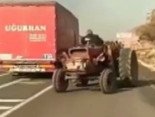 Emniyet şeridinde zikzaklar çizerek ilerlerken başka bir araçta seyir halinde olan vatandaşın cep telefonu kamerasına yakalanan traktörün, yoldan geçen bir tırın altında kalmaktan son anda kurtulması da görüntüde yer aldı. Aynaları olmayan traktörle adeta ölüm yolculuğu yapan yaşlı adam, daha sonra sanayi sitesine ayrılan yoldan sağa dönerek gözden kayboldu.