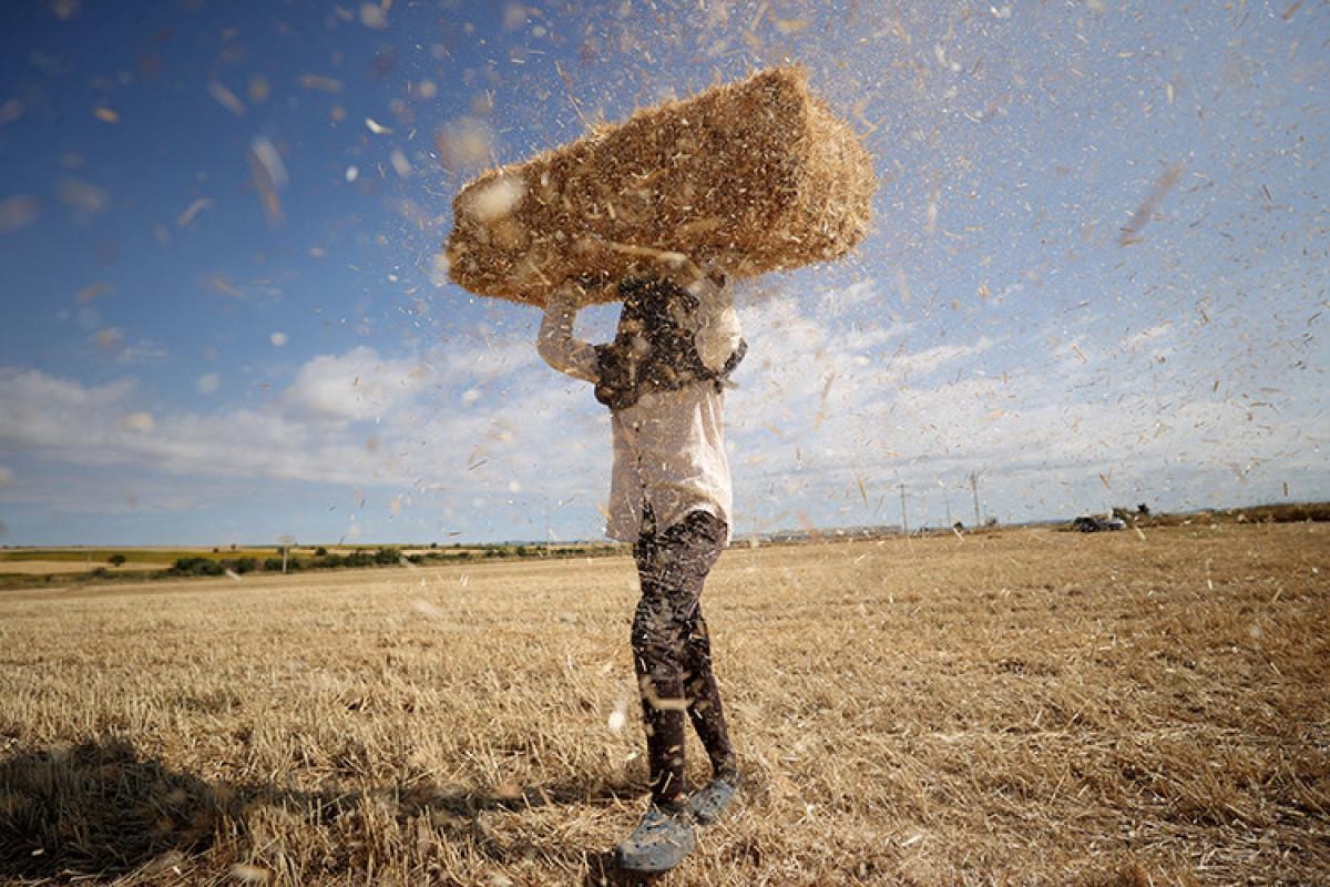 Öğle saatlerinde sıcaklığın ve römorktaki balyaların sayısının artmasıyla işçiler için zorluk da katlanıyor.