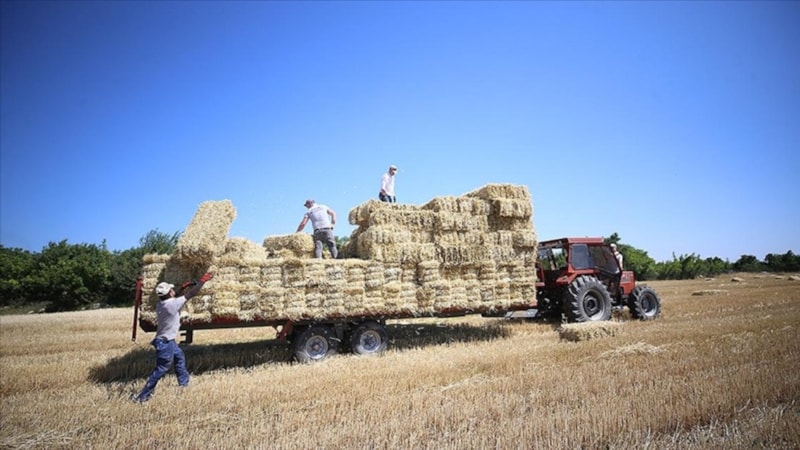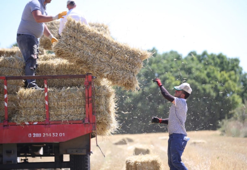 Buğday hasadı tamamlandı. Tarlada kalan samanlar balya işçilerince toplanarak, kamyonlara yüklenmeye başladı.