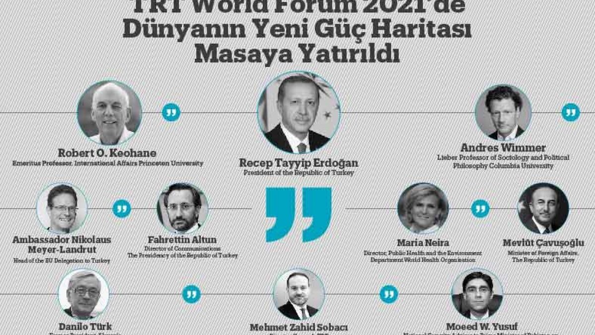 Dünya gündemini yakından ilgilendiren konularla bu yıl da dünya basınında yoğun ilgi gören TRT World Forum 2021, "Güç ve Paradoks: 21. Yüzyılda Büyük Stratejiyi Anlamak " başlığı altında gerçekleşti. Yüksek teknoloji ile dünyayı bir araya getiren etkinlikte 9 açık oturum, 7 uzmanlarla yuvarlak masa toplantısı, özel söyleşi ve ünlü sanatçılar tarafından icra edilen canlı performanslar düzenlendi. Dünyanın dört bir yanından ulusal ve uluslararası 100’ün üzerinde uzman üst düzey konuşmacının katıldığı forumda, dünya gündemi masaya yatırıldı.