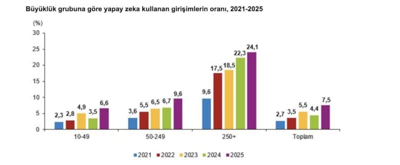 Yapay zeka teknolojilerinden herhangi birini kullandığını belirten girişimlerin oranı, 2021 yılında yüzde 2,7 iken bu oran 2025 yılında yüzde 7,5 oldu. Yapay zeka kullanan girişimler çalışan sayısı büyüklük grubuna göre incelendiğinde; 2025 yılında 10-49 çalışanı olan girişimlerin yüzde 6,6'sının, 50-249 çalışanı olan girişimlerin yüzde 9,6'sının ve 250 ve üzeri çalışanı olan girişimlerin yüzde 24,1'inin herhangi bir yapay zeka teknolojisi kullandığı görüldü. Bu oranlar, 2021 yılında 10-49 çalışanı olan girişimlerde yüzde 2,3, 50-249 çalışanı olan girişimlerde yüzde 3,6 ve 250 ve üzeri çalışanı olan girişimlerde yüzde 9,6 idi.