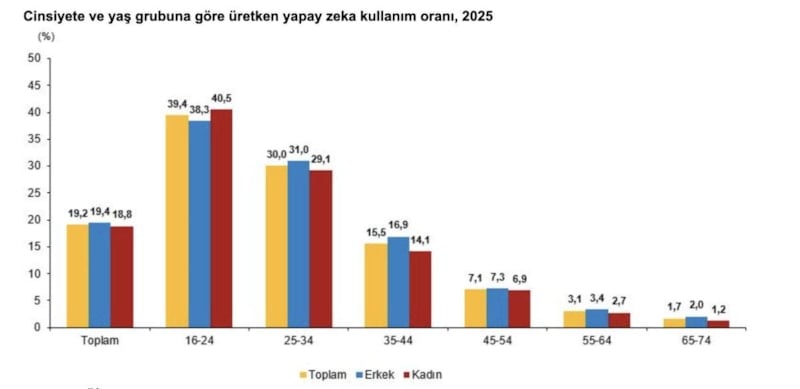 Yapay zeka kullanma oranı yaş grubuna göre analiz edildiğinde ise, en fazla yüzde 39,4 ile 16-24 yaş grubunda yer alan bireylerin yapay zeka kullandığı, bunu yüzde 30 ile 25-34 yaş grubunun, yüzde 15,5 ile 35-44 yaş grubunun takip ettiği saptandı.