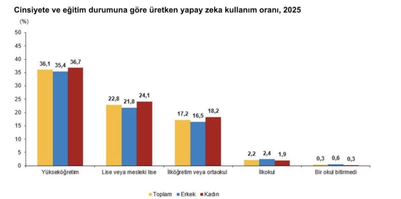 Yapay zeka kullanan bireyler eğitim durumuna göre incelendiğinde; 2025 yılında yapay zeka kullanma oranının en fazla yüzde 36,1 ile yükseköğretim mezunlarında olduğu belirlendi. Bunu, yüzde 22,8 ile lise veya mesleki lise mezunu, yüzde 17,2 ile ilköğretim veya ortaokul mezunu, yüzde 2,2 ilkokul mezunu bireyler takip etti. Bu oran cinsiyete göre incelendiğinde ise, ilkokul mezunları ve bir okul bitirmeyenler arasında erkeklerin kadınlara göre daha yüksek oranda yapay zeka kullandığı, ilköğretim veya ortaokul, lise veya mesleki lise ile yükseköğretim mezunlarında kadınların kullanım oranının erkeklerin üzerinde olduğu görüldü.