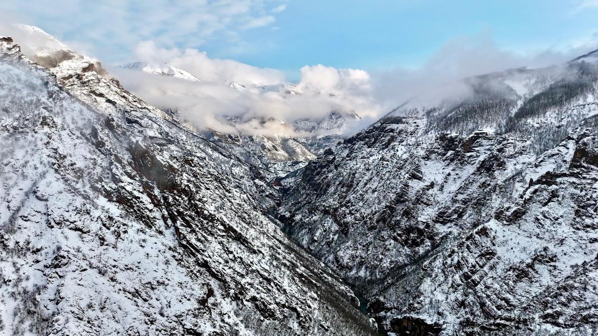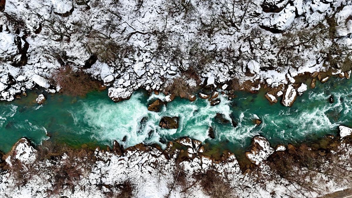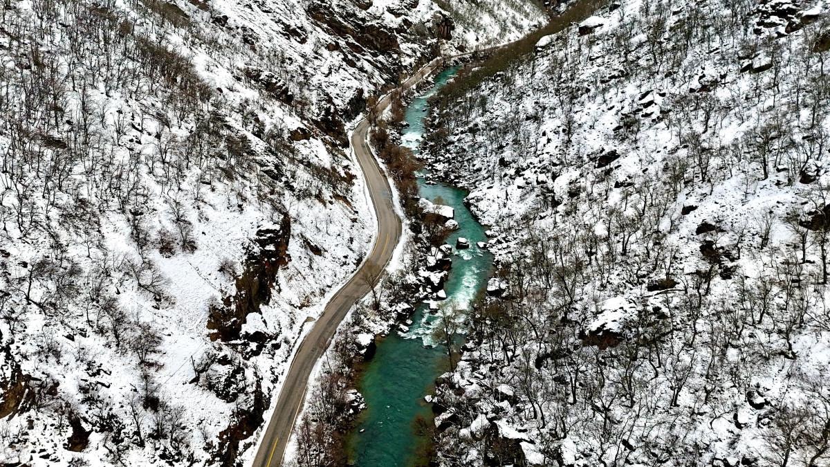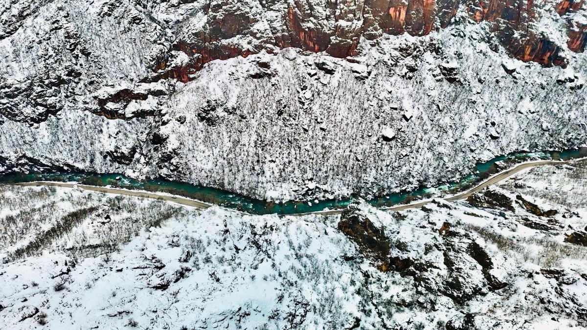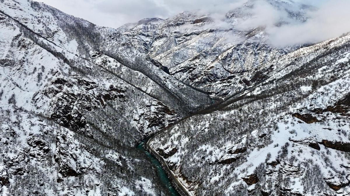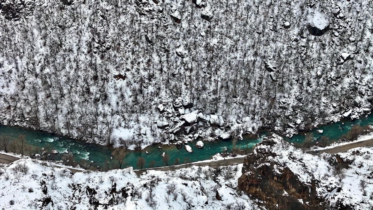 Eşsiz doğa manzarasına bürünen milli parktaki kış güzelliği, drone ile görüntülendi.