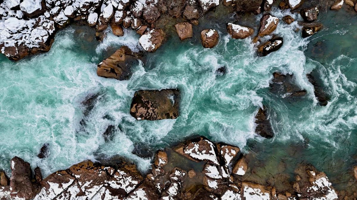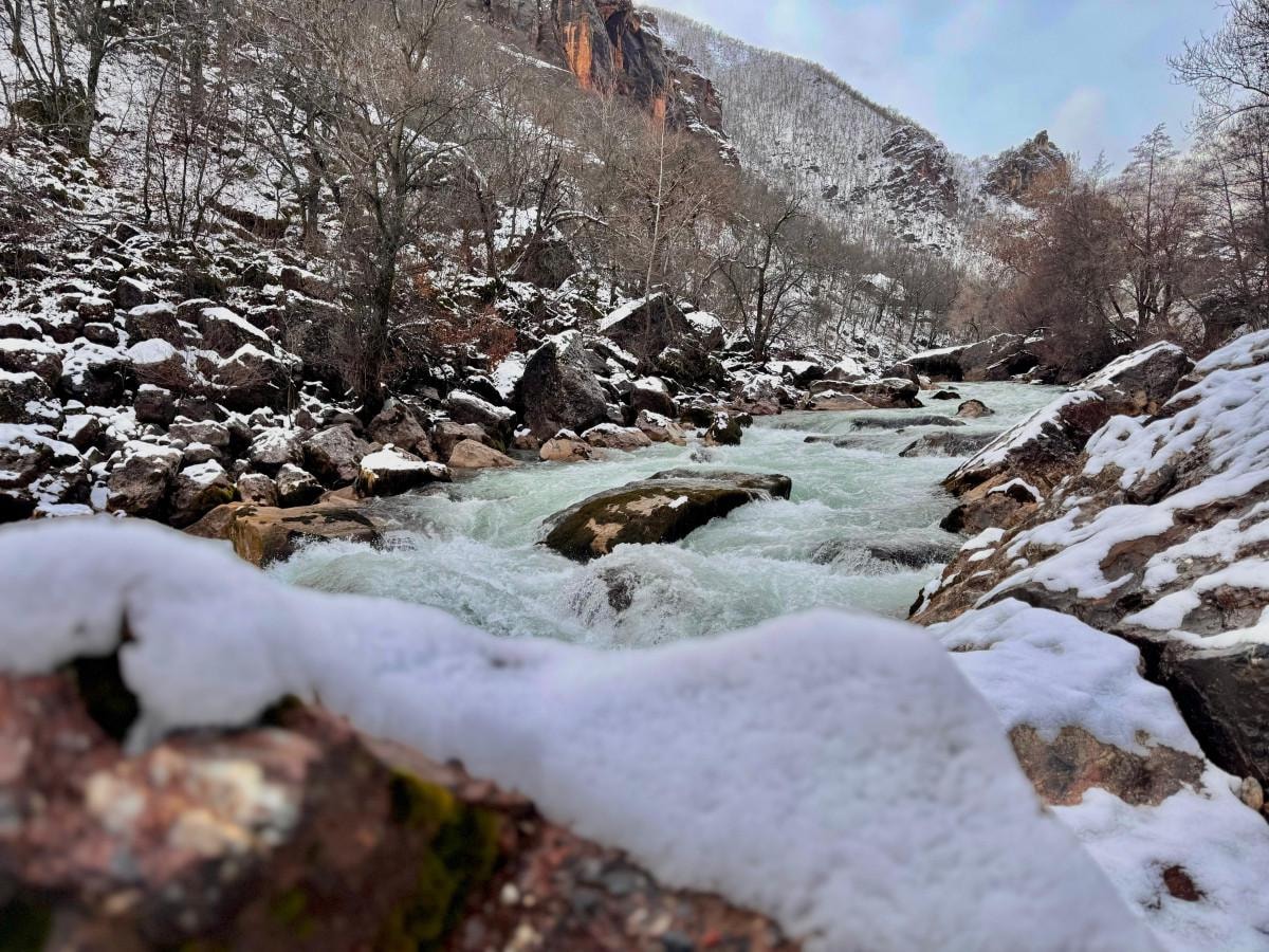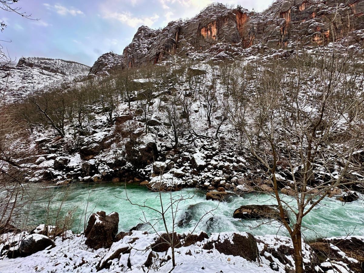 Ovacık ilçesine 15 kilometre uzaklıkta bulunan Ziyaret köyünde 40 gözeden çıkan ve onlarca derenin suyuyla beslenen Munzur Çayı, kar yağışının ardından beyaza bürünen dağların ve meşe ağaçlarının arasından akarken seyirlik görüntüler oluşturdu.
