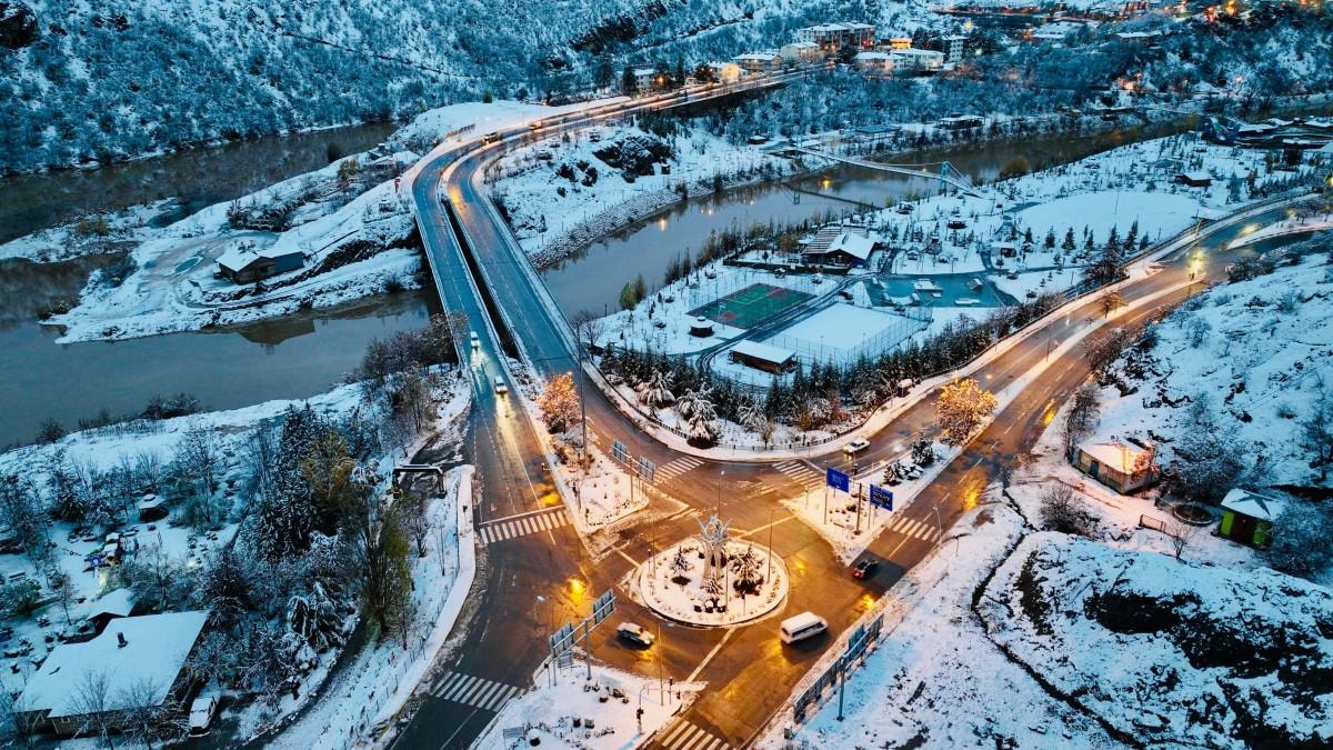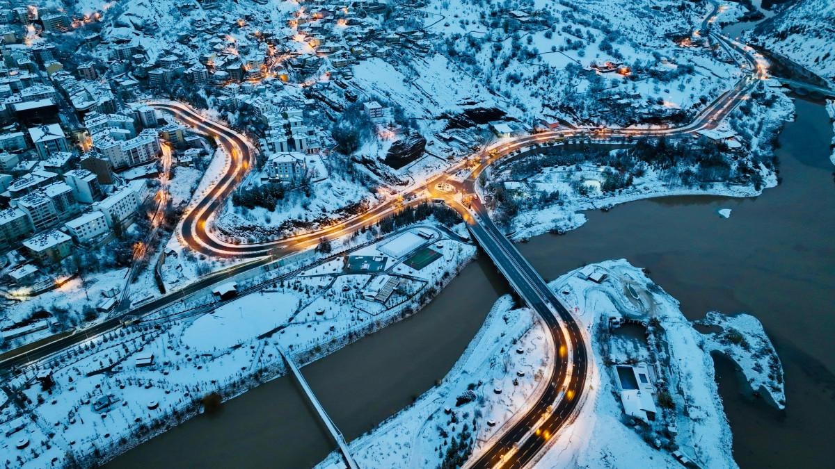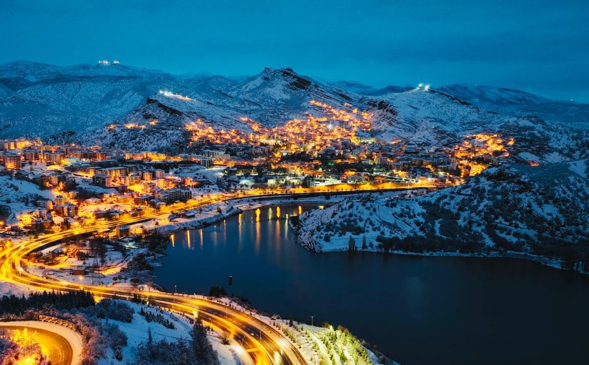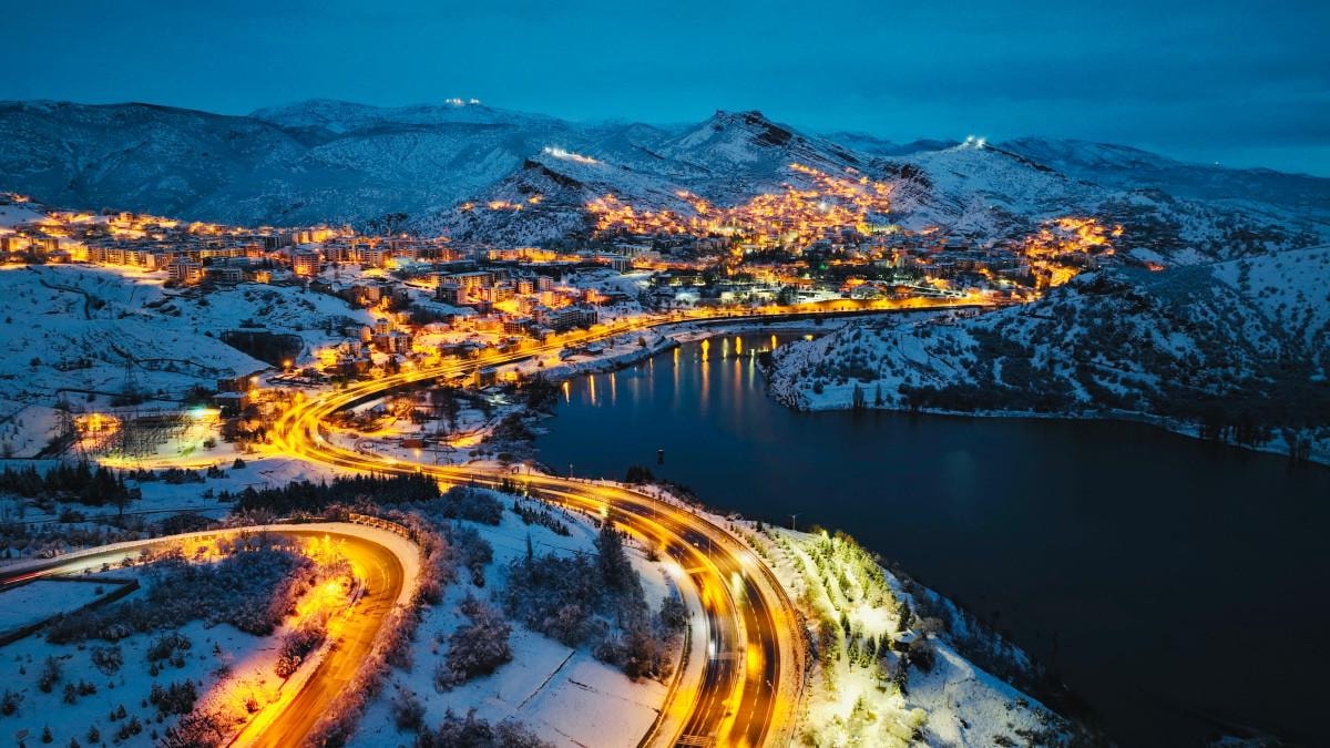 Dağların arasında kurulan şehir merkezindeki Uzunçayır Baraj Gölü ve sokak ile evlerin ışıkları karla birleşti, gören hayran kaldı.