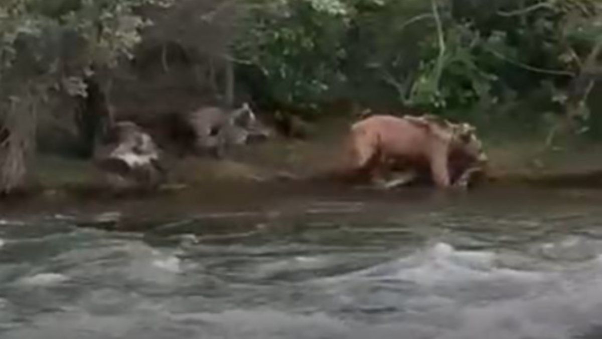 Yavrunun tedirgin olması üzerinde anne ayı sudan çıkarak, yavrusunun yanına gitti.