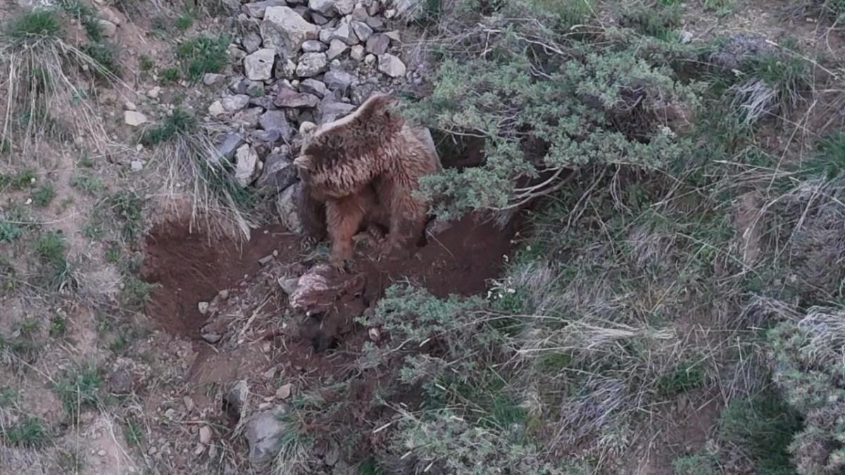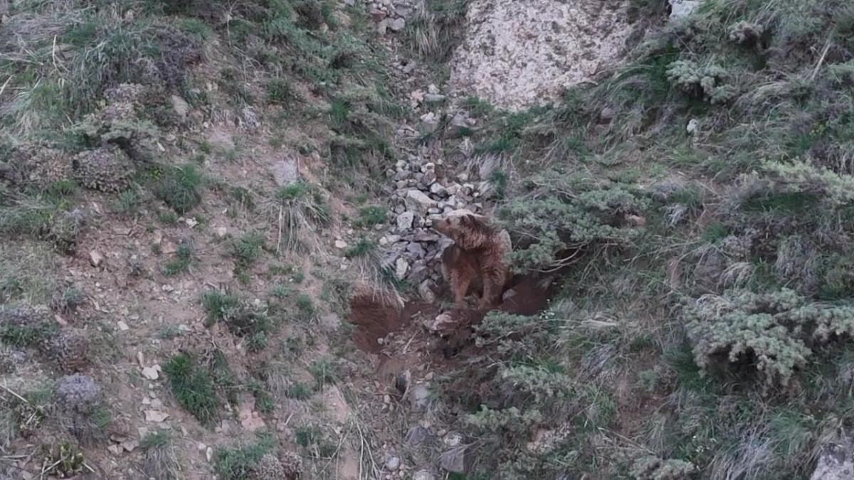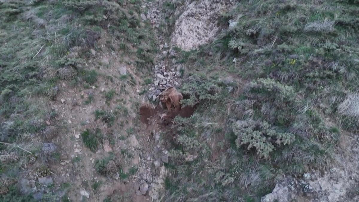 Ahıra 3 kilometre uzaklıkta dağ yamacında telef olan hayvanı gömen boz ayılar, havadan drone kamera ile görüntülendi.