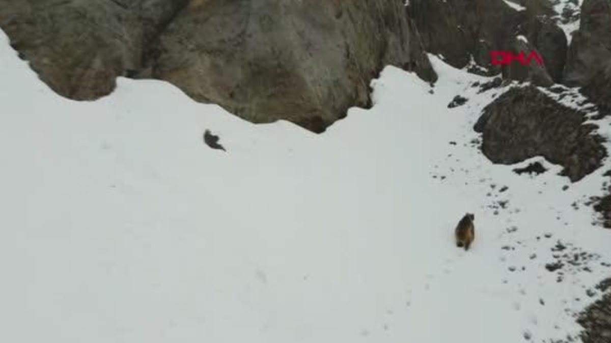 İki bozayı, bölgeye giden dağcılar tarafından drone ile havadan görüntülendi. Bir süre karlı arazide gezinen ayılar, kayalık alana giderek gözlerden kayboldu.