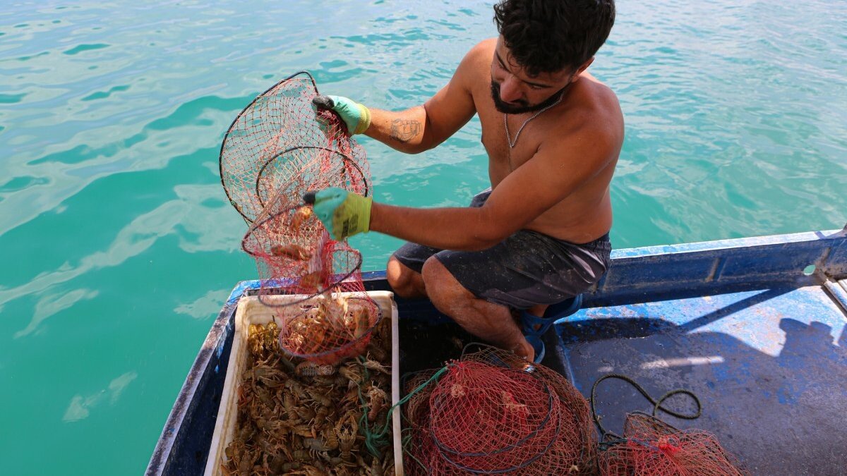 Kerevit ağlarını 10 ile 50 metre derinliğe salan Demir, daha sonra bir hafta bekleyerek ağlara takılan kerevitleri topluyor.