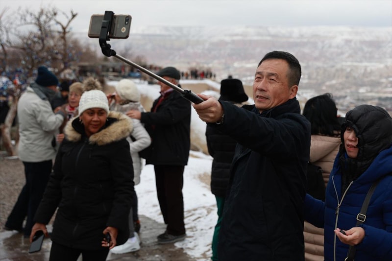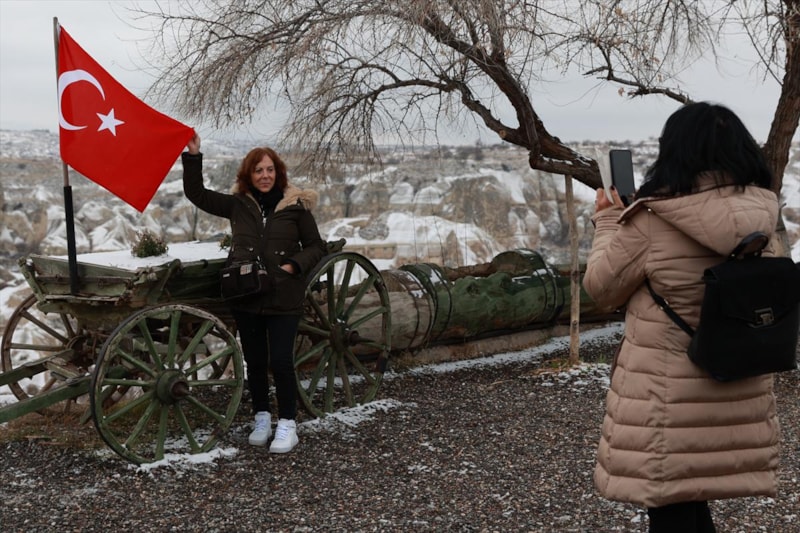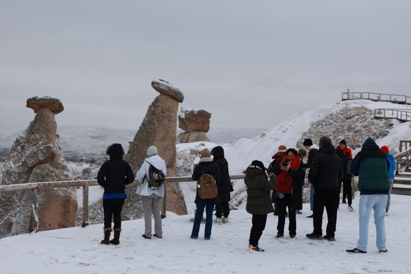 Kapadokya'ya gelen turistler, karla kaplı bölgeyi gezerek fotoğraf çekti.