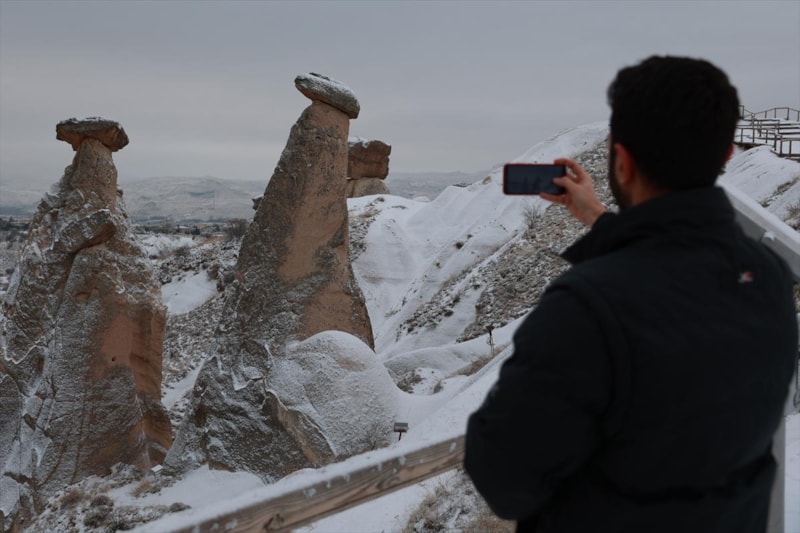 Türkiye'nin en önemli turizm merkezlerinden biri olan Kapadokya, sabah saatlerinden itibaren beyaz örtüyle kaplanınca turistler, her anı ölümsüzleştirdi.