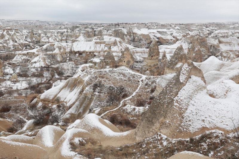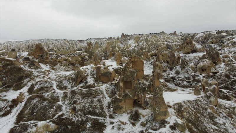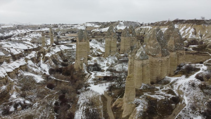 Türkiye'nin en önemli turizm merkezlerinden biri olan Kapadokya'da peribacaları beyaz örtüyle kaplandı.