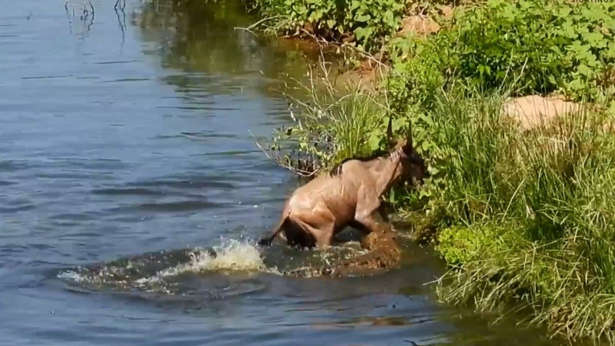 Çaresiz hayvan, kendisini suya çeken timsahtan kurtulmak için büyük mücadele verdi.