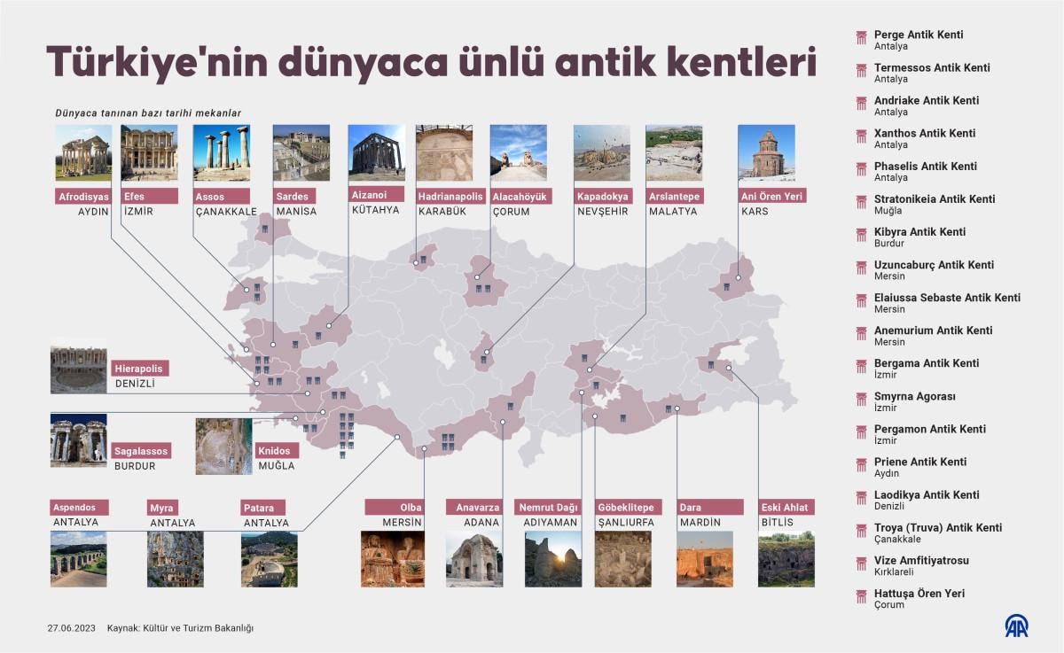 Bu antik kentlerin içinde İzmir Efes ile Bergama, Nevşehir Kapadokya, Kars Ani Ören Yeri, Antalya Aspendos, Antalya Patara ile Myra, Adıyaman Nemrut Dağı, Mardin Dara ve Şanlıurfa Göbeklitepe en ünlülerinden.
