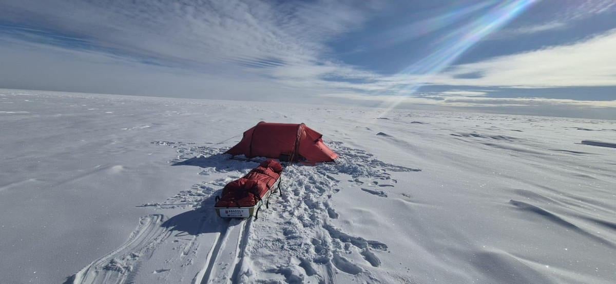 Bu sefer yürüyüş, Antarktika’dakinden farklı. Tüm ekipmanlarımızı, yiyeceklerimizi, kızak ve kayaklarımızı taşıyarak zorlu kayalıklar ve buzullar boyunca ilerleyeceğiz. İlk günlerde ayaklarımıza krampon takarak ilerleyeceğiz, kayaklar ancak buzlar kaymaya başladığında kullanılacak.