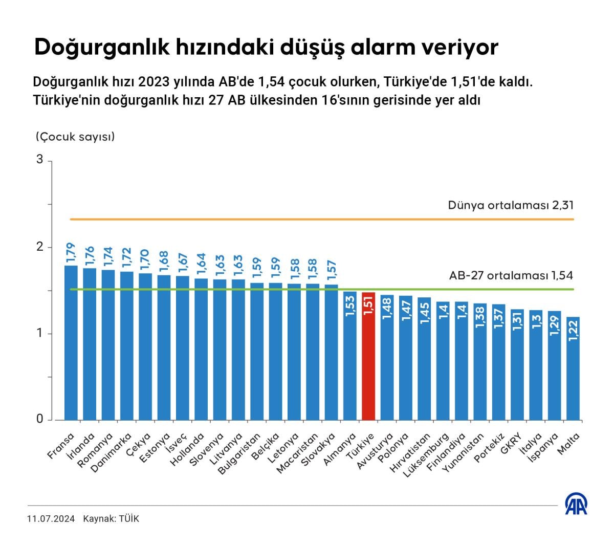 Türkiye, AB ülkeleri arasında çocuk ve genç nüfusu açısından avantajlı bir konumda olduğu halde, doğurganlık hızındaki düşüş alam veriyor. Doğurganlık hızı 2023'te AB'de 1,54 çocuk olurken, Türkiye'de 1,51'de kaldı. Türkiye'deki doğurganlık hızı 27 AB ülkesinden 16'sının gerisinde bulunuyor.