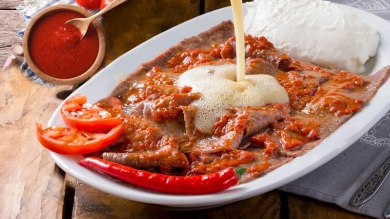 Bursa'ya gittiğinizde mutlaka yemeniz gereken bir lezzettir, iskender. İskender, üstündeki tereyağ, domates sosu, yanındaki yoğurt ve altındaki yağlı pide parçaları ile servis ediliyor.