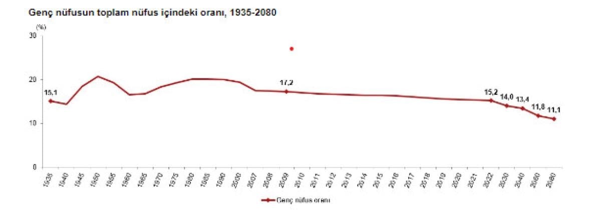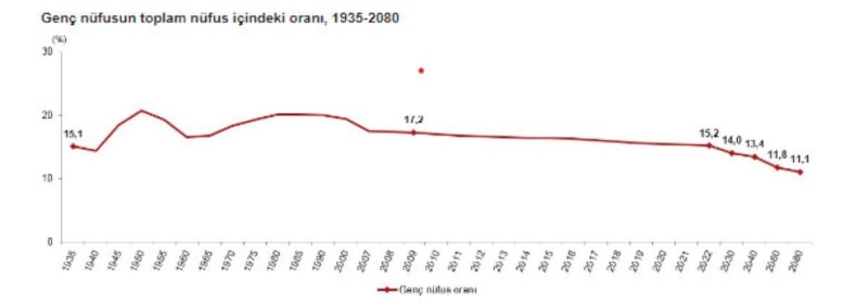 Nüfus projeksiyonlarına göre genç nüfusun toplam nüfus içindeki oranının 2030 yılında yüzde 14, 2040 yılında yüzde 13,4, 2060 yılında yüzde 11,8 ve 2080 yılında yüzde 11,1'e düşeceği öngörüldü.
