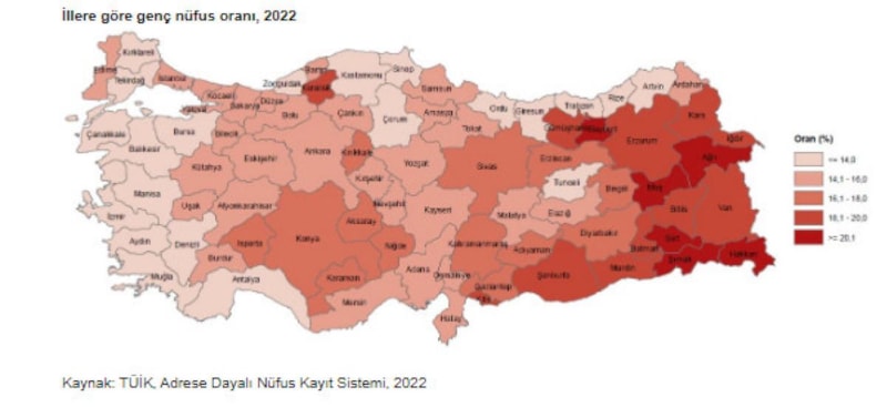 ADNKS sonuçlarına göre 2022 yılında genç nüfus oranının en yüksek olduğu il, yüzde 22 ile Hakkari oldu. Bu ili yüzde 21,7 ile Şırnak ve yüzde 21,1 ile Siirt izledi.