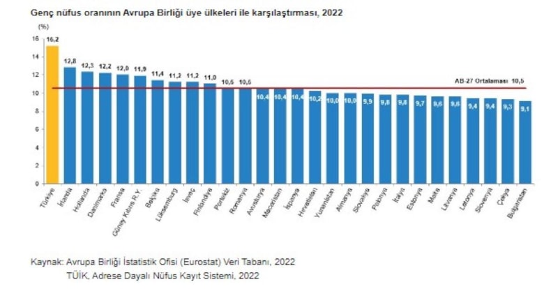 Türkiye'nin genç nüfus oranının yüzde 15,2 ile Avrupa Birliği (AB) üyesi 27 ülkenin genç nüfus oranlarından daha yüksek olduğu görüldü. AB üyesi 27 ülkenin genç nüfus oranları incelendiğinde, 2022 yılında genç nüfus ortalaması yüzde 10,5 oldu.
