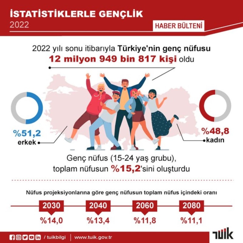 Türkiye İstatistik Kurumu (TÜİK) İstatistiklerle Gençlik, 2022 araştırmasına göre Türkiye nüfusunun yüzde 15,2'sini genç nüfus oluşturdu.