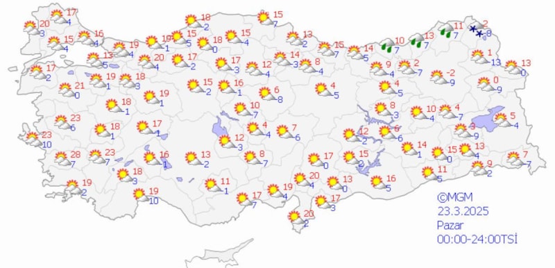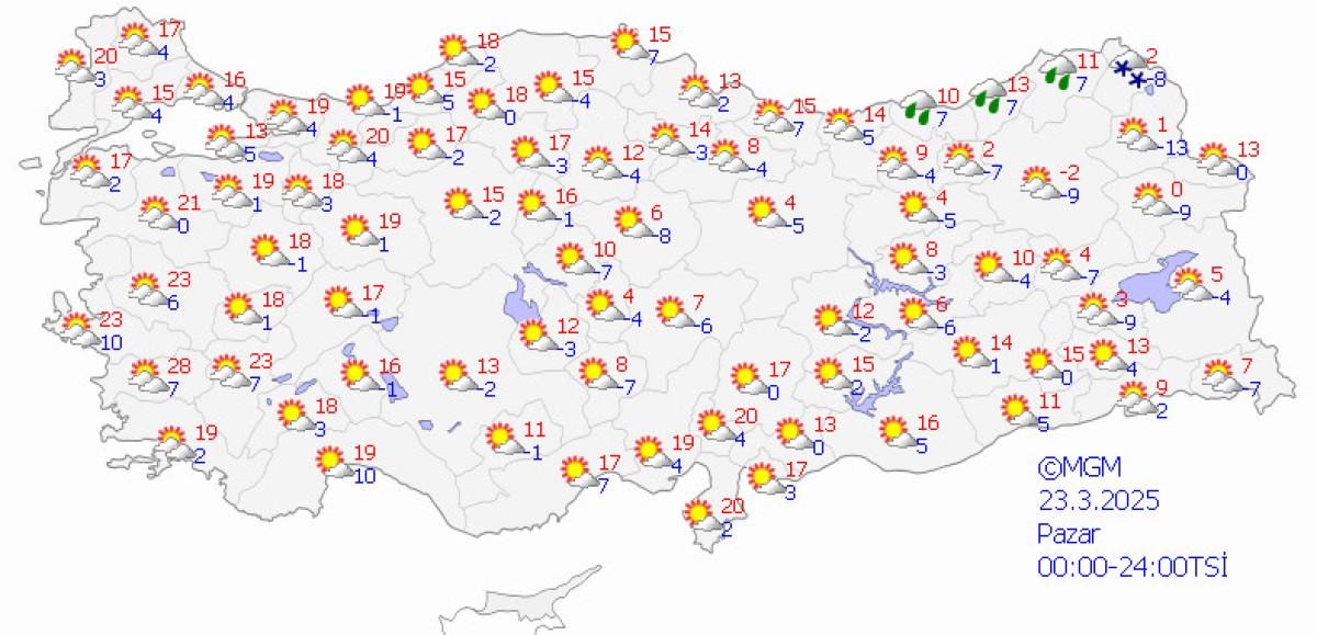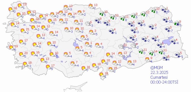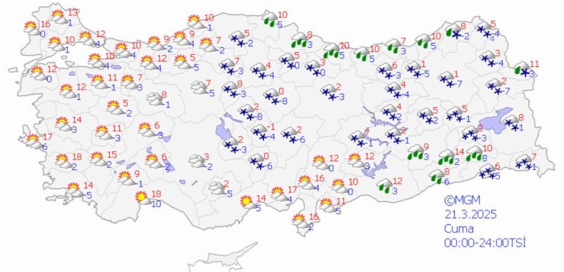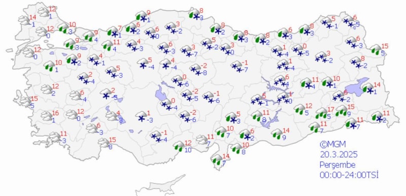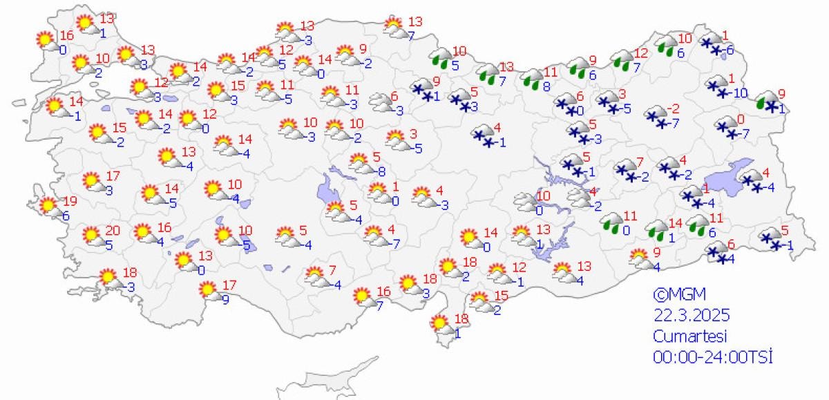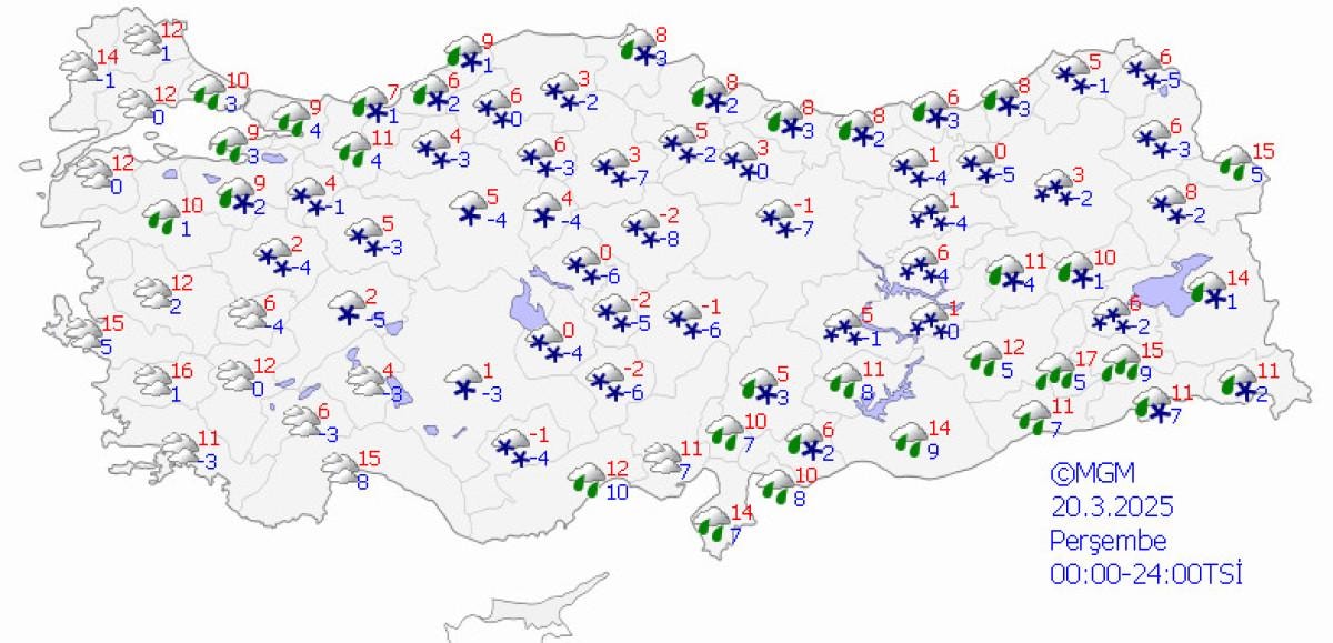 Meteoroloji tarafından yapılan tahminlere göre: Ülkemiz genelinin parçalı ve çok bulutlu, Marmara'nın doğusu, Doğu Akdeniz (Adana hariç), İç Anadolu, Karadeniz, Doğu ve Güneydoğu Anadolu'nun yağışlı geçeceği tahmin ediliyor. Genellikle karla karışık yağmur ve kar, Akdeniz kıyıları ile Güneydoğu Anadolu’da yağmur ve sağanak şeklinde görülmesi beklenen yağışların, Doğu Anadolu'nun batısı, Güneydoğu Anadolu'nun doğusu, Samsun, Sinop, Ordu, Giresun, Erzurum, Bitlis, Şırnak ve Hakkâri çevrelerinde yer yer kuvvetli olacağı tahmin ediliyor. Sabah ve gece saatlerinde iç ve doğu kesimlerde buzlanma ve don bekleniyor. Doğu Karadeniz’in iç kesimlerinin yüksekleri ile Doğu Anadolu’nun yüksek ve dik yamaçlarında çığ tehlikesi bulunmaktadır.